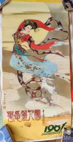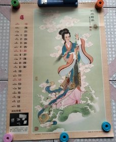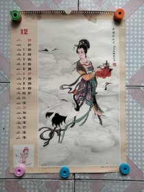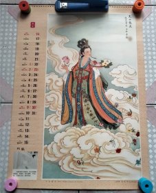 老挂历画工笔仕女1张 天女散花 王仲华绘画瑕疵品 外围大致尺寸52cm × 37 cm