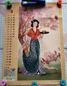 老挂历画工笔仕女1张 人面桃花 董淑嫔绘瑕疵品 ~外围大致尺寸52 × 37 cm