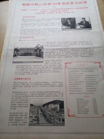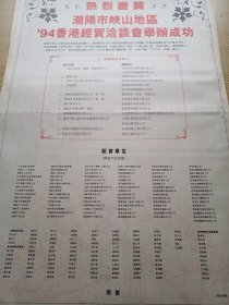 热烈庆贺潮阳市峡山地区94香港经贸洽谈会举办成功。90年代报纸一张。