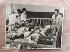 彩色展览老照片 东城区回民幼儿园为幼儿进行体检 塑封照片一幅 46*30厘米