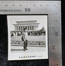 老照片:早期70年代末知青在毛主席纪念堂留念单人照(背景为诸多群众排队参观毛主席纪念堂)右下角有1979,1979,原版照片,光面相纸,黑白照,5.8×6.5厘米,无齿边相纸,gyx22503