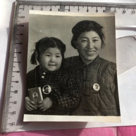 戴大像章的母女合影留念老照片