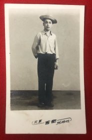 戴草帽、毛主席像章的男子留影老照片