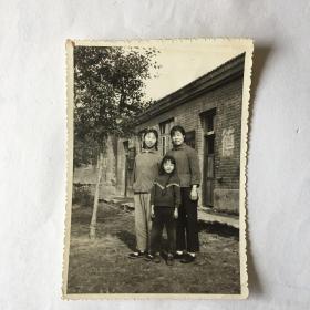 母子三人戴毛主席像章合影老照片