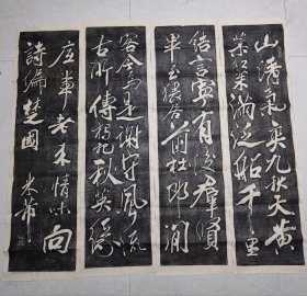 米芾《重九会郡楼》四条屏纯手工碑帖拓片。北宋文学家书法家米芾于1088年重阳节在浙江湖州创作的一首七言律诗,全诗以“山清气爽九秋天”起兴,描绘了黄菊红茱满船、群贤毕至的聚会场景。