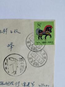1990年1月5日马年庚午年邮票首日实寄封,封图是洛阳唐三彩马 寄戳为河南白马寺戳,加盖马象形字 庚午年篆书戳。特点是落地戳日期错,应为1月8日。非常罕见。