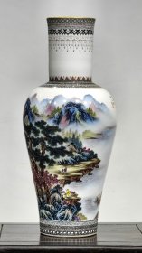 【大清乾隆年制】官窑粉彩通景山水纹赏瓶。 “乾隆”时期,属各系列彩瓷发展的高峰期,此瓶则是此背景下映射出的一件佳品。整体施釉均匀饱满,釉水肥腴,白釉处洁白细腻,温润如玉。彩色处施彩堆垛,触摸有明显凹凸质感回馈皮肤。整体画篇左右大通景山水,传统题材画篇,整体画篇舒朗分明,主题突出,落落大方,远近拉富有层次,赋予空间质感。整体器型端庄周正,健硕挺拔,敦厚古朴,古香古色,整体全品无残,佳品一件