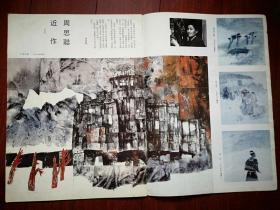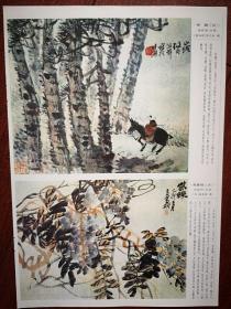 彩铜版美术插页(单张),周思聪国画四幅《广岛风景》《远方》《母与子》《林间小屋》,周菱国画《卖花女》刘向平国画《牛圈》,聂鸥国画三幅《毛驴》《绿树丛中》《归途》26.5x35cm