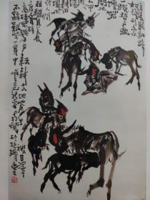 画页(散页印刷品)--国画---黄胄作品选【五驴图、三驼图、双驴、赶驴图、群鸡图】。荷花鸳鸯【王雪涛】。双吉图【程十发】。日映红【萧淑芳。吴作人题】。956