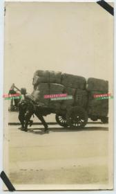 抗战时期 山东省青岛市街头用轱辘车拉货物的苦力 原版老照片一枚