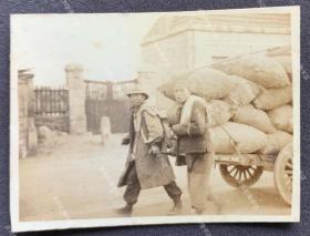 民国时期山东青岛海边街头,拉重型货物的苦力老照片一张,11.1X6.5厘米,泛银