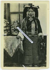 民国早期穿民族传统服饰的西藏贵族妇女老照片。17.8X12.8厘米, 泛银。
