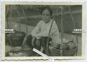 民国时期南方街头零担售卖小吃食品的年轻妇女老照片。8.5X5.8厘米,泛银。