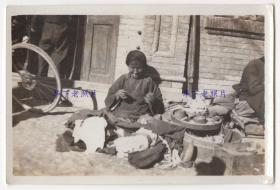 民国时期,天津振记古画店发行的中国风俗银盐照片:摆地摊做针线活的妇女。
