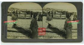 清末民国立体照片-----清末民初日本别府地区的渔业,海边晾晒沙丁鱼的渔民妇女