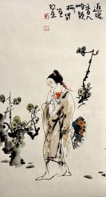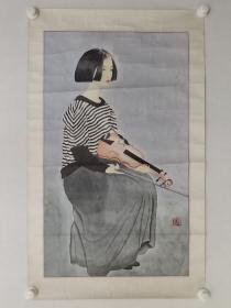 保真书画,当代优秀人物画画家,刘静云《拉琴的少女》国画一幅,原装裱镜心,尺寸78×46cm