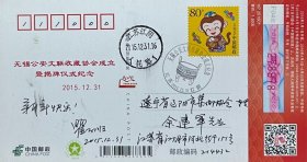 2016恭贺新禧贺年有奖明信片,盖2015年12月31日江苏江阴人民路日戳和江苏江阴《无锡公安文联收藏协会成立纪念》纪戳实寄,瞿百顺寄。