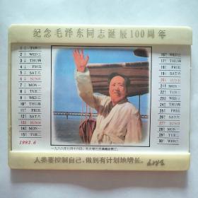人类要控制自己,做到有计划地增长。毛泽东 纪念毛泽东同志诞辰100周年台历。塑料摆件(1993年6张1年全.双面毛主席像塑料卡片)尺寸:17.3cm*13.7cm