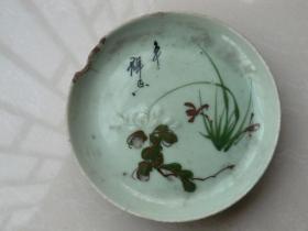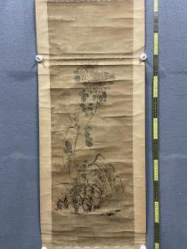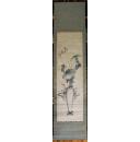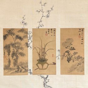 【趣味】田能村竹田竹兰菊三小品合幅,日根对山补梅,合作作品,四君子图,绢本绫裱无轴头,带日根对山1862年所题木箱,画心88.7*47.8。形式极为罕见,颇有意趣。盒竹田签客