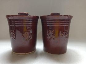 《“晨曦”字款旋纹酱红釉带孔盖陶瓷盅》陶瓷罐·陶瓷茶杯·药膳罐·蒸煮杯·蒸煮罐·陶罐·药罐·食罐约2000-2010年代左右(云南本地制,约500ml装左右)一对合售