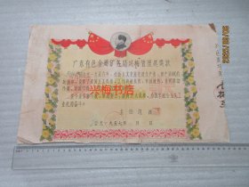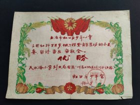 1960年5月由上海市虹口区少年宫颁发的证书。内容提及“三面红旗万岁,做了探索自然奥秘的小尖兵,画画、写诗、画画、海歌会”等,(可能存在文字表述相关情况)