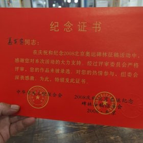 纪念证书。聂英家同志。在庆祝和纪念2008北京奥运碑林征稿活动中,感谢您对本次活动的大力支持,经过评审委员会严格评审,您的作品会被录取选,对您的热情参与,组委会深表感谢。为此,特颁发此证。