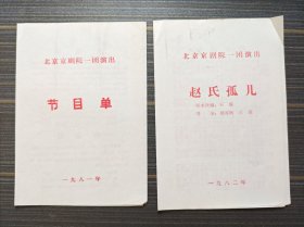 节目单 赵氏孤儿 北京京剧院 一团演出 1981 1982 两张
