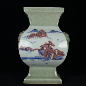 清乾隆豆青釉青花釉里红山水纹四方瓶