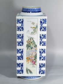 清乾隆 青花粉彩人物故事四方琮式瓶