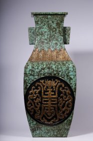 清乾隆雕刻松石绿鎏金百福百寿四方瓶