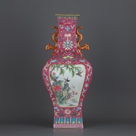 清乾隆 胭脂红轧道粉彩开窗花鸟纹螭龙耳四方瓶