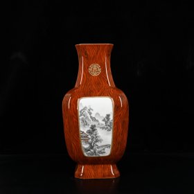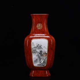 清乾隆木纹釉开窗墨彩山水阁楼诗文四方瓶