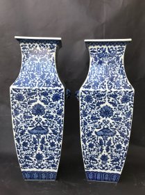 清乾隆青花缠枝莲福寿尊兽耳四方瓶一对