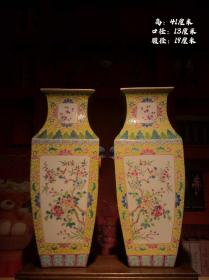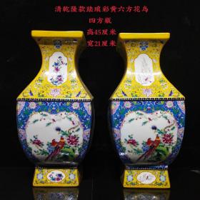 清乾隆款珐琅彩黄六方花鸟四方瓶