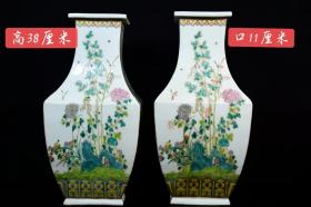 大清乾隆年制粉彩花卉四方瓶,造型别致,纯手绘画工。