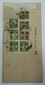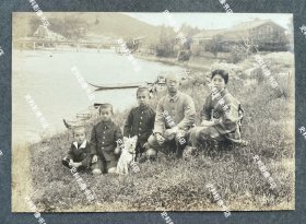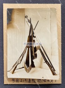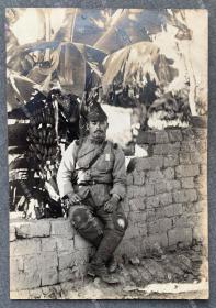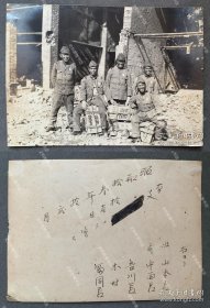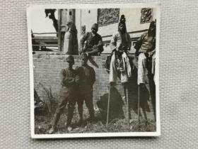 民国1939年(昭和14年)3月9日《日军在山西省太原市 运城 临汾 曲沃 解县 潞安 系列31:古建筑旁边休息的足高踊 高跷艺人》黑白老照片一张!尺寸:长5.3厘米×宽5.3厘米。