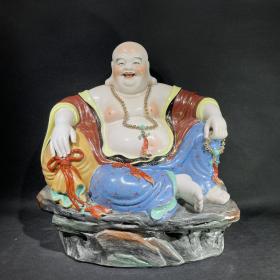 民国名家瓷塑弥勒佛 左手持佛珠 右手拂钱袋,开口便笑,笑古笑今,大肚能容,容天容地 开脸喜庆 保存完整