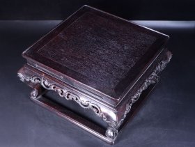 旧藏:老紫檀木花几座。 规格:面长31.5厘米、宽31.5厘米、高19厘米,重2328克。 简介:此藏品取材上乘紫檀木,木纹清晰漂亮,做工精致,卯榫结构,皮壳好,收藏、置花盆雅品。