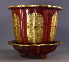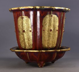 旧藏老钧瓷包金镶嵌宝石花盆一套