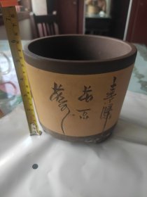 旧藏.手工雕刻花鸟竹叶纹文字老紫砂花盆(带款)