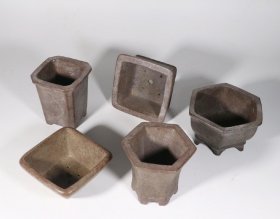 旧藏.手工雕刻花卉文字老紫砂小花盆五个一组(带款)