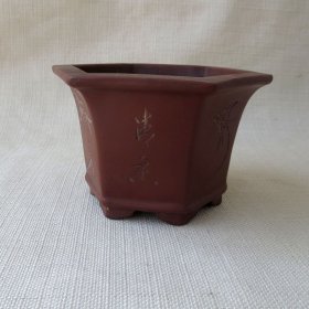 精品雕刻文字、花卉----六方紫砂花盆(老货)