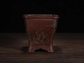 老紫砂花盆 四方造型 四面雕刻花盆 手工雕刻花瓶