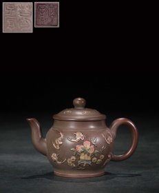 【古珍玩藏】.【历代壶艺】 【福寿加彩壶】【葛子厚】 【尺寸】长15cm,宽9.2cm,高10cm 【简述】葛子厚,清嘉庆时宜兴制壶高手,生卒年月不详。《阳羡砂壶图考》云:“子厚,嘉庆间人,缪颂宜兴,子厚为造壶。”