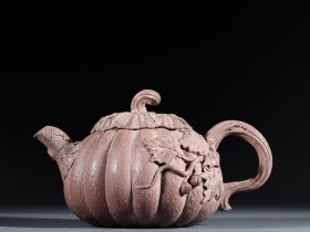 回流:老紫砂描金福寿壶。 尺寸:长15.5厘米、宽9.5厘米、高10.5厘米。 简介:此藏品用料上乘,壶身泥绘蝙蝠、寿字,描金,壶式古朴典雅,做工精致,款识:葛子厚。裹浆醇润。全品相。