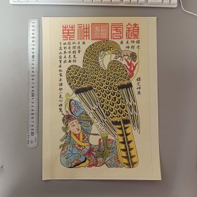 《镇宅神英图》为传统民间年画,主题是驱邪镇宅。画面中心为威猛神鹰,叼小兽、踩邪祟,象征镇压不祥、护佑平安。上方朱红题字「镇宅神英」,两侧文字如「妖邪奔走出」强化辟邪主旨。色彩鲜艳浓烈,以红、黄、绿为主,具典型年画吉庆风格。此类图像贴於门户,反映民间对家宅安宁的祈愿,融合信仰与艺术,体现传统文化中敬畏自然、趋吉避凶的心理需求。