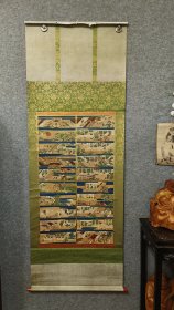 日本親鸞聖人一代记 本願寺行状图 纸本 印刷 朱红木轴,纵166Cm横60Cm,品相好。 亲鸾 Shinran(1173~1263),日本佛教净土真宗初祖。曾名范宴,绰空,善信,愚秃亲鸾等。谥号见真大师。 (编号F586)