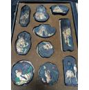 清代朱红色漆器方盘5个,木胎制作,尺寸10.5x10.5x2.2cm,盘面朱红色,边缘包浆自然。每个盘子都有老旧包浆,适合收藏或摆件使用。整体品相如图,有正常使用痕迹。
