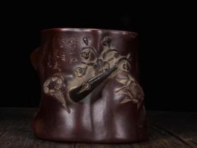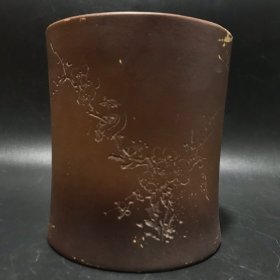 老紫砂雕喜上眉梢诗文笔筒