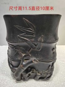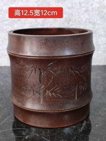 老紫砂雕竹子纹诗文笔筒